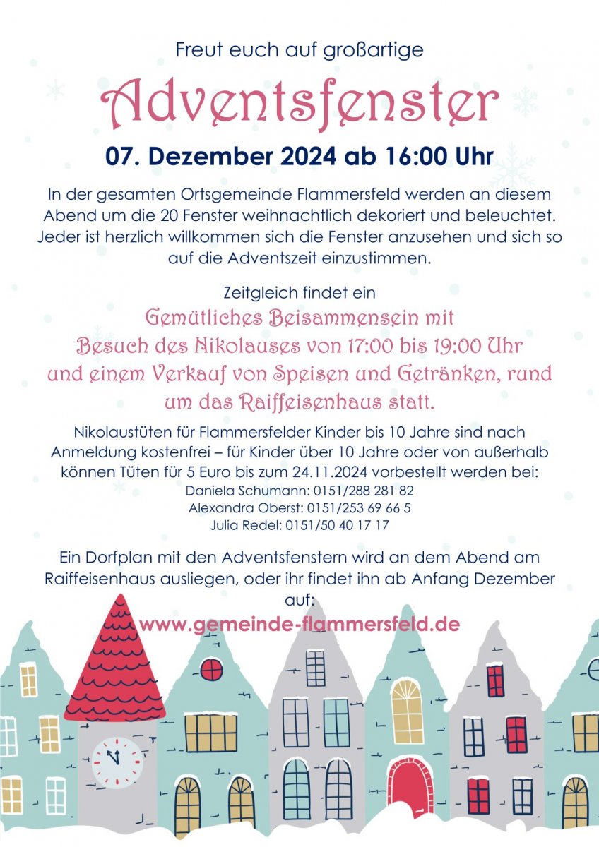 In der gesamten Ortsgemeinde Flammersfeld werden an diesem Abend um die 20 Fenster weihnachtlich dekoriert und beleuchtet. Jeder ist herzlich willkommen sich die Fenster anzusehen und sich so auf die Adventszeit einzustimmen.